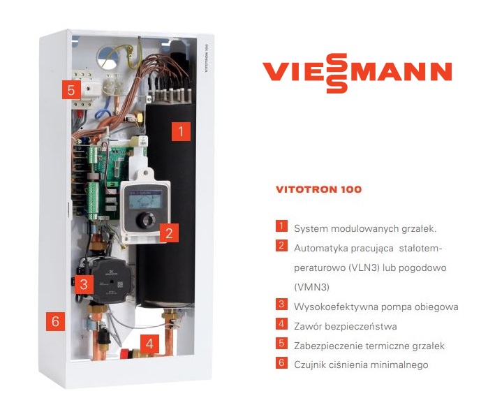 Instalacja kotła Vitotron 100 jest niedroga i nie wymaga przyłącza gazowego, budowy komina, kotłowni ani pomieszczenia na składowanie opału. Do pracy urządzenia wystarczy tylko przyłącze elektryczne. Wysoki komfort cieplny i bezobsługową pracę tego urządzenia zapewnia m.in. sterowanie pogodowe (typ VMN3). Przy sprawności kotła na poziomie 99,4% (sprawność rzeczywista) gwarantuje ono energooszczędną eksploatację systemu grzewczego.