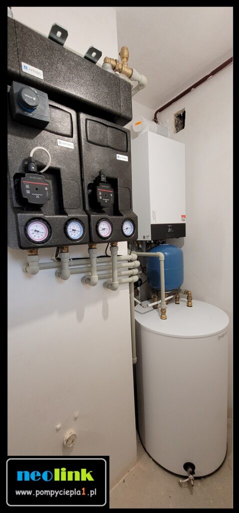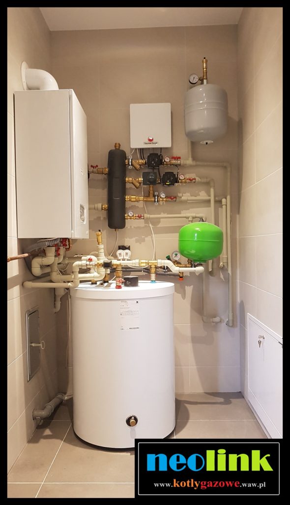 Saunier Duval Thelia Condens 18kW. Kotłownia ze sterowaniem pogodowym dwóch stref grzewczych (grzejnikowa i podłogówka). Całość na zespole mieszającym AFRISO. Automatyka strefowa Saunier Duval. Dodatkowo naczynie przeponowe CWU antylegionella