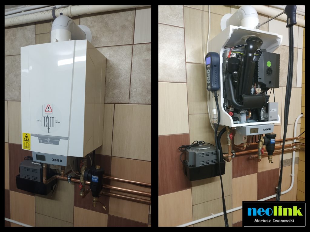De Dietrich MCR 3 EVO 15T z pompką kondensatu Grundfos i filtrem magnetycznym Caleffi.W trakcie analizy spalin.